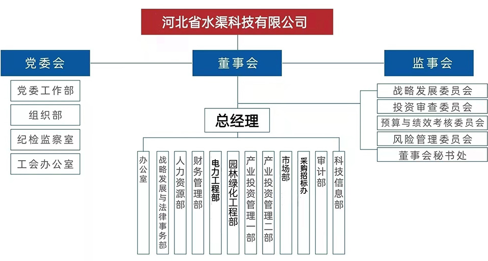 河北省水渠科技有限公司在成立之初即按照《公司法》和省政府的要求,設(shè)立了股東會(huì)、董事會(huì)、監(jiān)事會(huì)、總經(jīng)理辦公會(huì)等各司其職、互相制衡、規(guī)范運(yùn)作的法人治理結(jié)構(gòu)。集團(tuán)總部設(shè)總經(jīng)理辦公室、綜合管理部、工程部、財(cái)務(wù)稽核部、項(xiàng)目研發(fā)等職能部門。